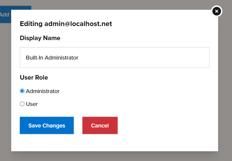 To edit a user, click the 3 dots icon in the Options column of the table, then click Edit User Details. In the modal pop-up, you can specify a new display name and/or change the user role. Once you have finished making changes, click the Save Changes button, or click Cancel to revert the changes.