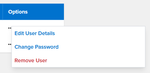To change a user’s password, click the 3 dots icon in the Options column of the table, then click Change Password. In the Change Password for User screen, enter and confirm the user’s new password. Click Change Password to validate and apply the new password, or click Cancel to discard the change.
